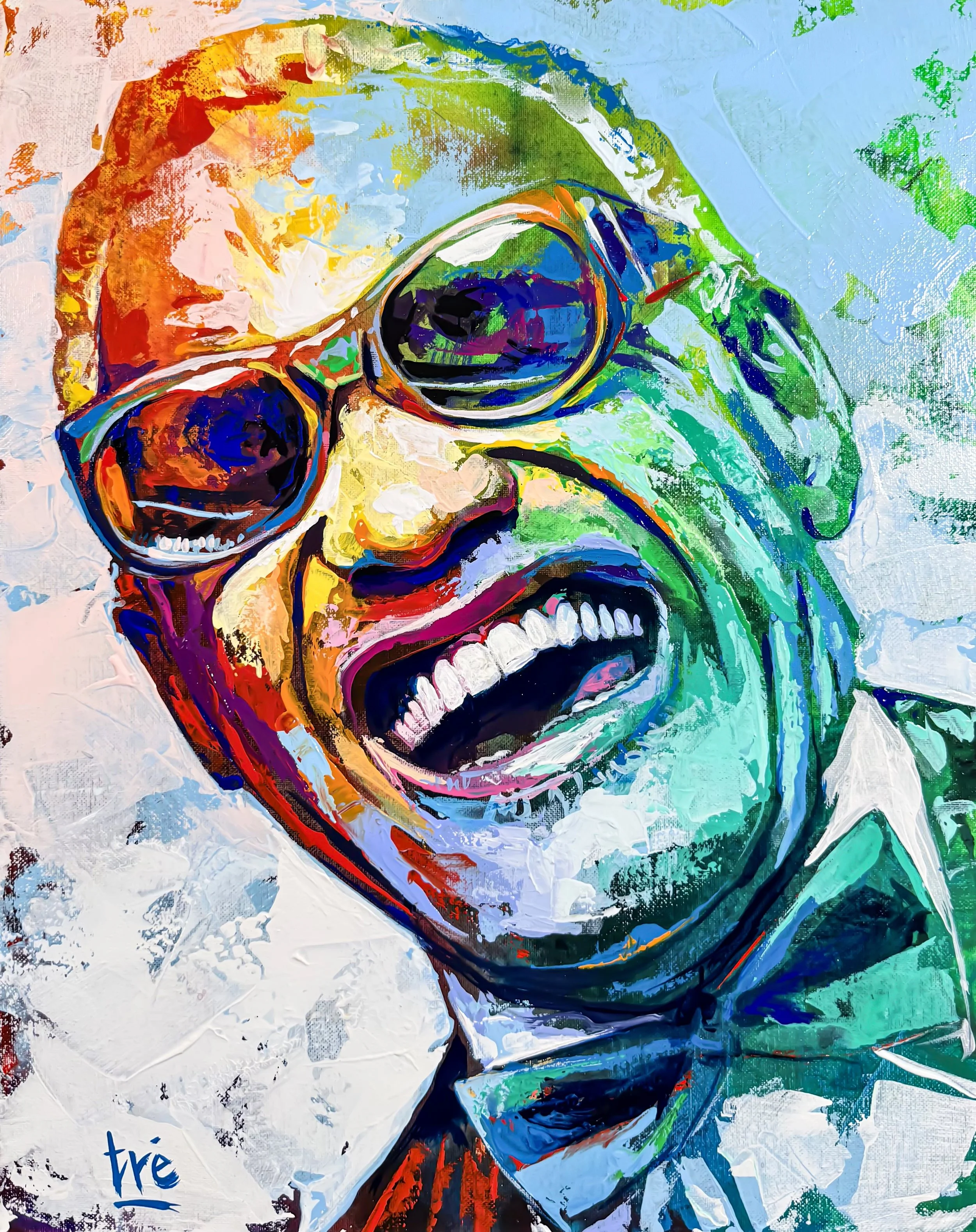 by Tré TaliaferroThis painting of Ray Charles captures the essence of musical genius through bold color, confident brushwork, and an intimate compositional focus. Executed with a vibrant, contemporary palette, the portrait centers Ray’s expressive face and signature sunglasses, using layered tones to convey both the tactile presence of skin and the reflective surfaces of his glasses. Subtle highlights across the cheekbones and forehead contrast with deeper, rhythmic shadows, creating a three-dimensionality that feels both immediate and reverent.